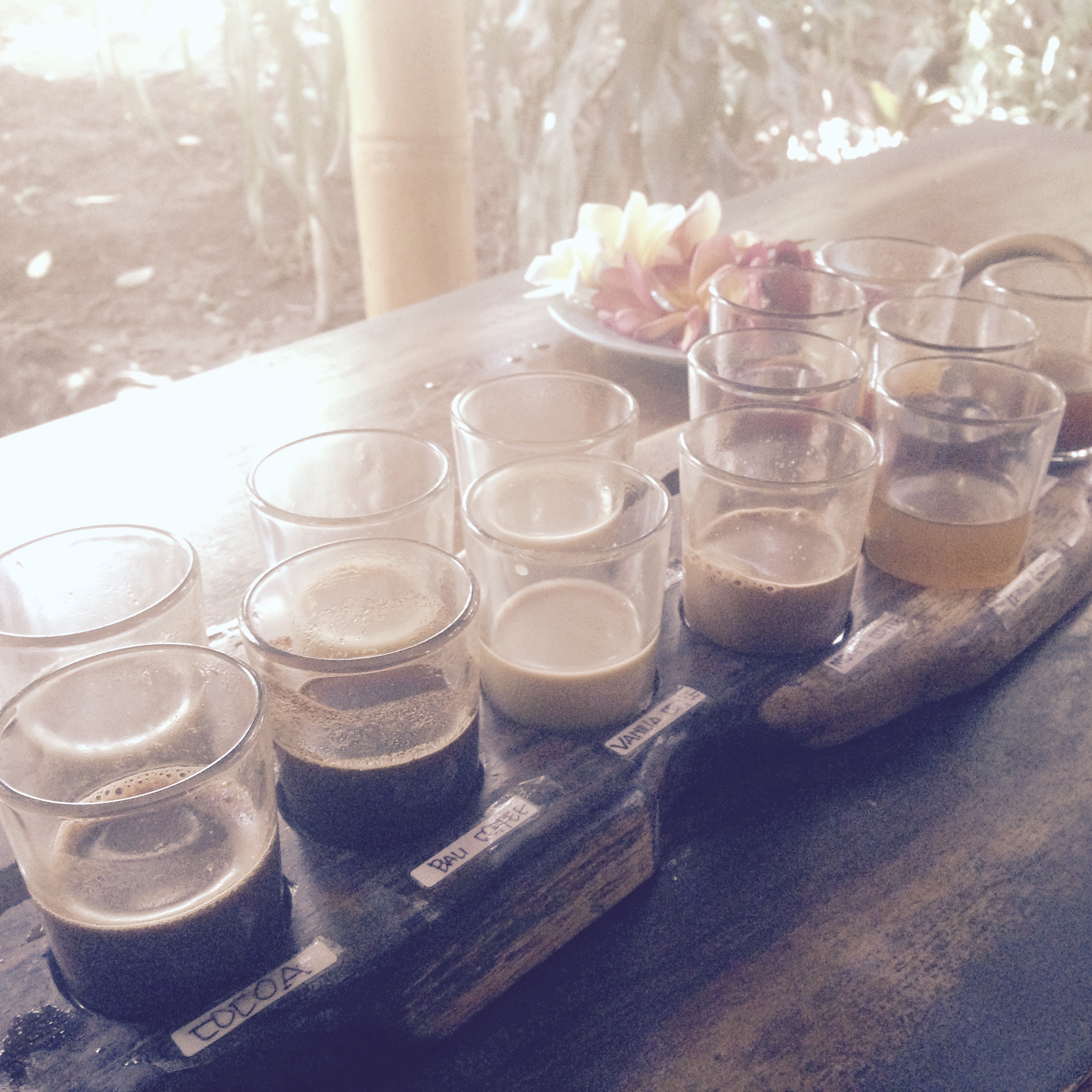 Bali ist bekannt für seinen feinen Arabica- Kaffee – und für den teuersten Kaffe der Welt: Kopi Luwak. Das sind halbverdaute Kaffeebohnen der Wildkatze namens Fleckenmusang. Eine Tasse Kaffe kostest im Schnitt 50 Euro. Darauf hatten wir keinen Bock – vor allem, weil die gestiegene Nachfrage skrupellose Bauern auf den Plan ruft. Sie halten die Wildkatzen in Käfigen und mästen die Tiere mit den Kaffeekirschen. Wir entschieden uns für eine „normale“ Kaffeeverkostung. Vanille, Zimt, Kokos… jeder Kaffe war brüllend süß und die Fotos sagen alles, oder? Man kann die Tasse Kopi Luwak auch für 2,50 trinken – die Kollegen von Munchies haben ein günstiges Plantagencafé gefunden, was auch hinsichtlich der Tiere korrekt klingt.