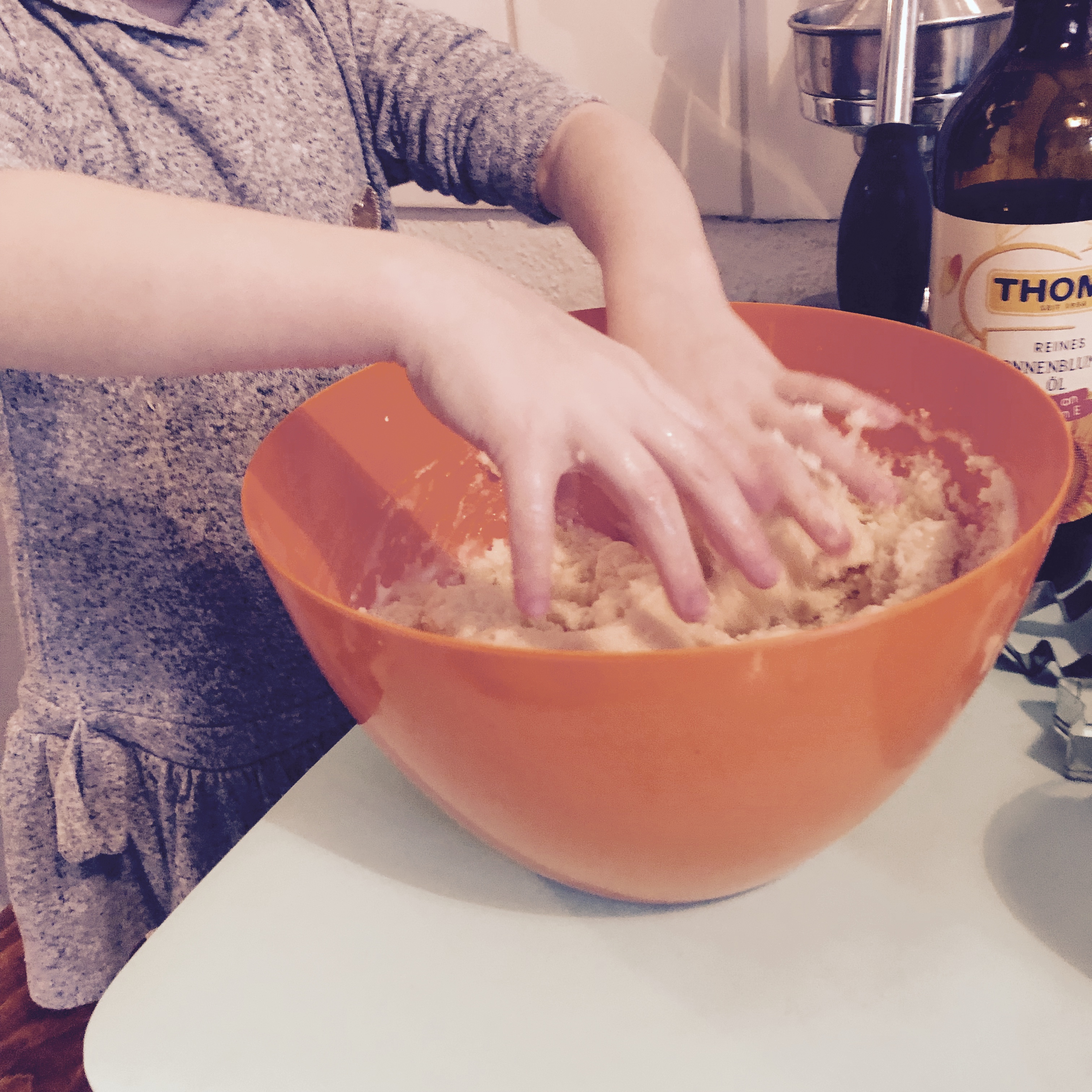 Die Zutaten miteinander vermischen und zu einem glatten Teig verrühren – entweder mit den Händen oder den Knethaken. Ist der Teig zu trocken, dann einfach etwas Öl dazu. Sollte er zu feucht sein, dann Salz und Mehl hinzufügen.
