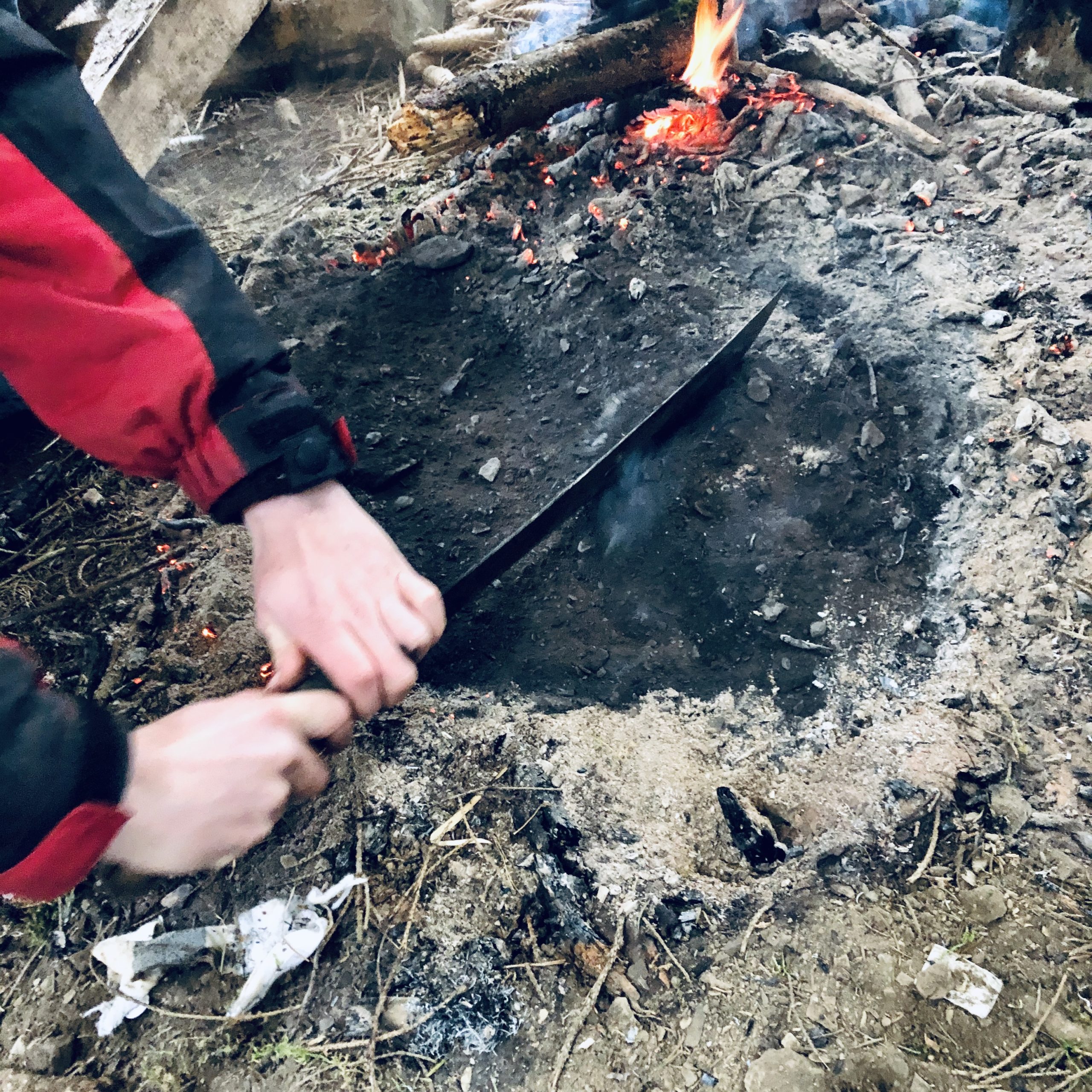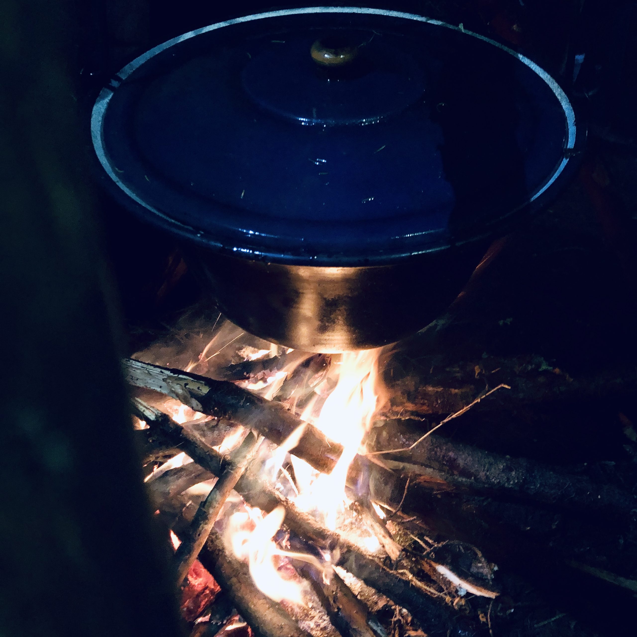 Sobald die Unterkunft stand, wurde Holz gesammelt. Wusstet ihr, dass man selbst nasses Holz verbrennen kann? Wir hatten unsere Zweifel und wurden eines Besseren belehrt. Denn Holz ohne Rinde brennt gut, es qualmt nur etwas mehr. Die Nässe sitzt vor allem in der Rinde. Also: fürs nächste Lagerfeuer Holz ohne Rinde suchen oder diese entfernen.